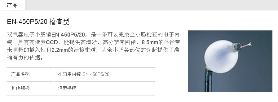 雙氣囊電子小腸鏡EN-450P5/20,是一條可以完成全小腸檢查的電子內鏡。具有高像素CCD,能提供高清晰、高分辨率圖像,8.5mm的外徑帶來順暢的插入性和2.2mm的活檢鉗道,為全小腸各部位的診斷提供了準確有力的依據。