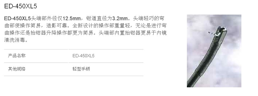 ED-450XL5頭端部外徑僅12.5mm,鉗道直徑為3.2mm。頭端輕巧的彎曲部使操作簡易,造影可靠。全新設計的操作部重量輕,無論是進行彎曲操作還是抬鉗器升降操作都更為簡易。頭端部內置抬鉗器更易于內鏡清洗消毒。
